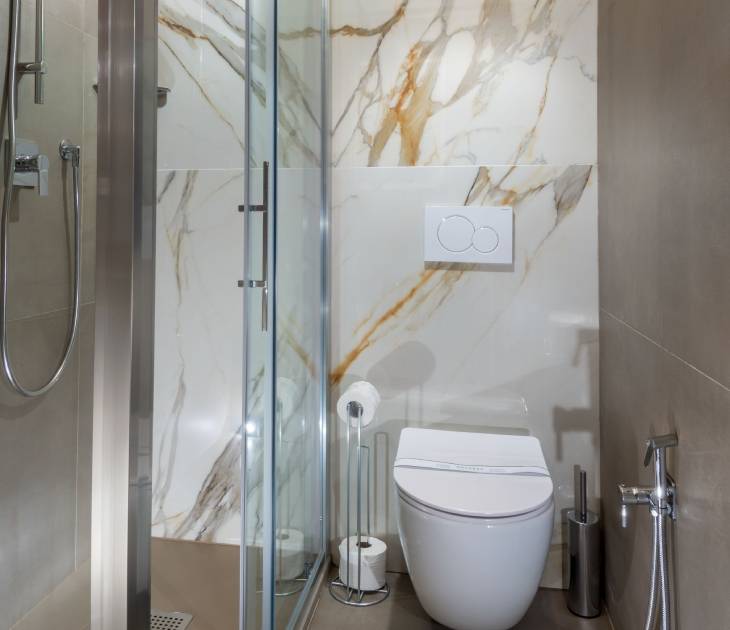 Bathroom with shower cubicle, hairdryer and shower head (no bidet).